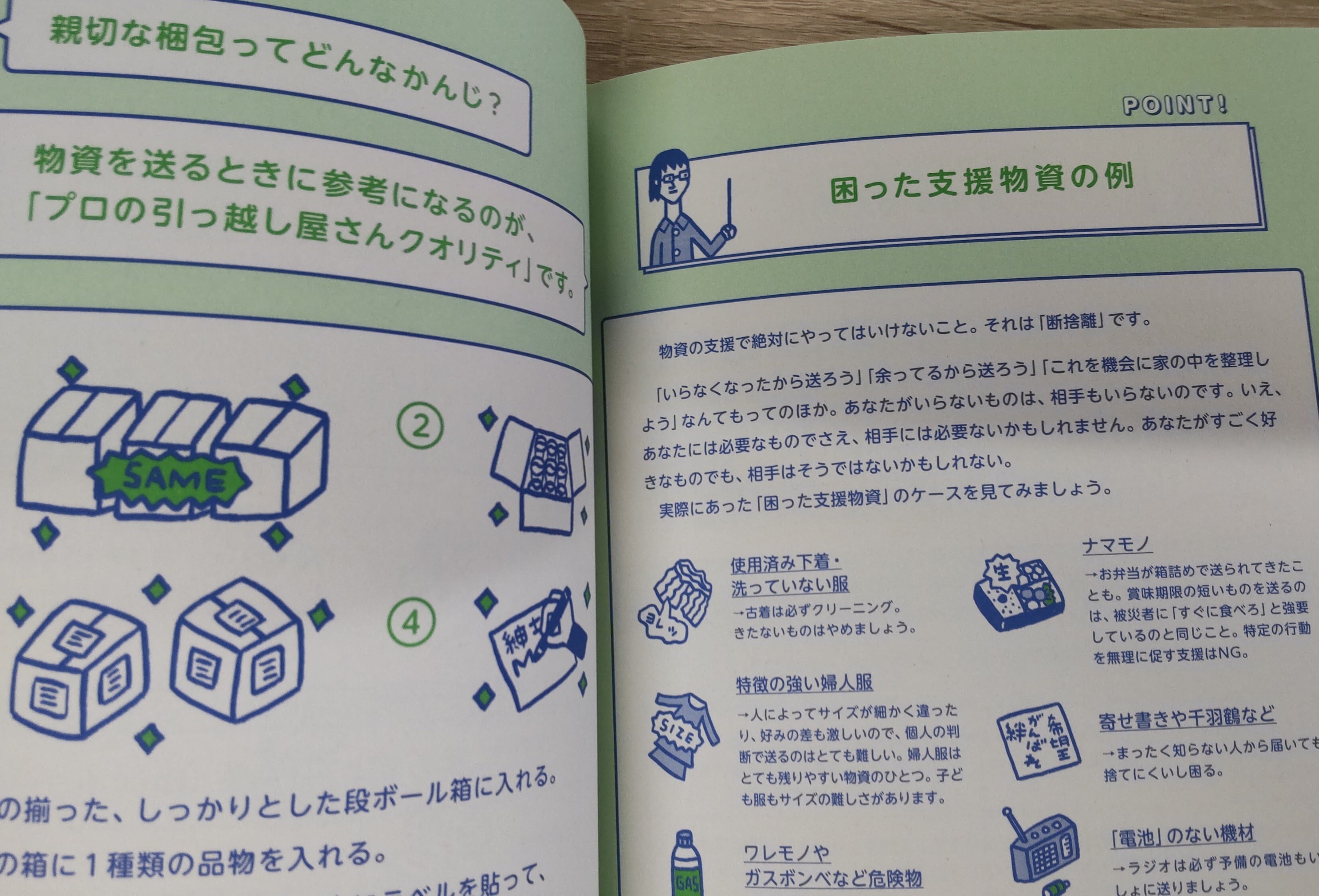 この本はお金での支援、モノでの支援、いろんな困ったことを解消する小さなアイデアなど、災害支援の事例をイラスト満載で紹介。