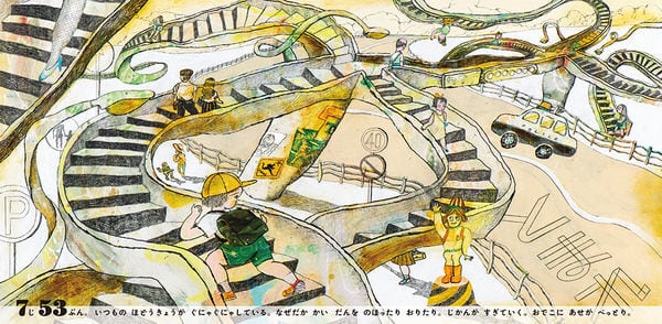 家を飛び出し、あわてて走る男の子。今日は絶対に学校に遅れちゃいけないのだ。でもゆくてには、水たまりじゃぶじゃぶ、歩道橋ぐねぐね、大きな犬たちがわんわん、踏み切りは閉まったまま。なんて、じゃまするものばっかり。さてこの男の子、学校に間に合うの? そして最後に待っているのは……。にぎやかハッピーな世界を突っ走るスピード感あふれる絵本。いつもの通学路が冒険の旅に変わるかもしれない!?